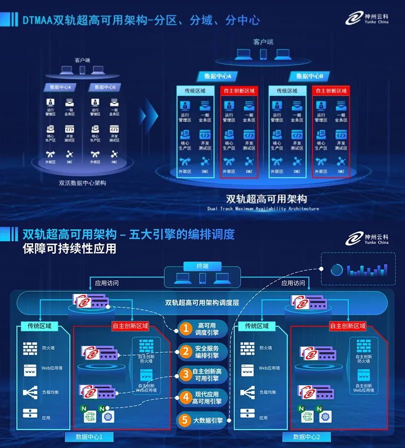 为助力银行业务高质量发展,更好地应对数字经济时代对可持续性的高要求,实现“信创”与“数字化”齐头并进,今年会创新性的推出了双轨超高可用架构。该架构在双活数据中心的分区调度基础上,增加信创域和非信创域的分域调度,实行信创域与传统域应用全量部署,使双中心运营变为双中心四区域并行运行,互为多活,将“0到1”的单轨建设道路变为分区分域协同的多活双轨超高可用架构。帮助客户在新架构下,保障“信创”的同时解决性能瓶颈,提升稳定性,保证应用可持续性,最终实现信创区域和非信创区域的平滑过渡,完成国产化替代目标。