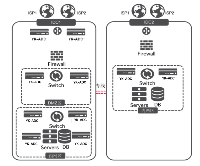 3、内网采用YK-ADC的RHI+OSPF和集群技术,做到IP架构的双中心双活应用调度